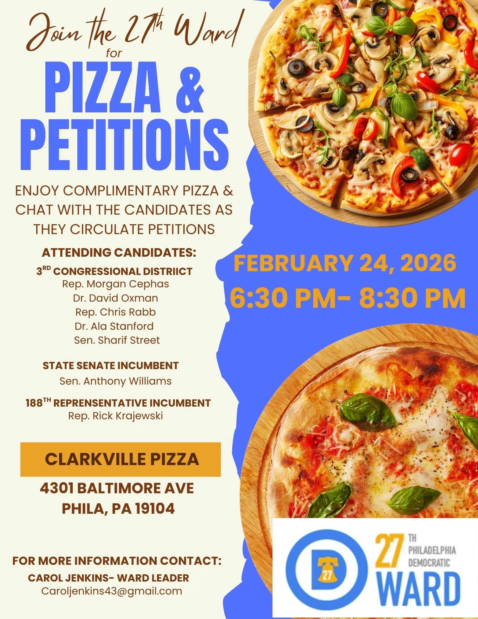 All voters interested in meeting the candidates for US Congress and the 188th State House seat are invited to have a casual conversation over a slice of pizza, complements of the 27th Ward, while signing your favorite’s petition.